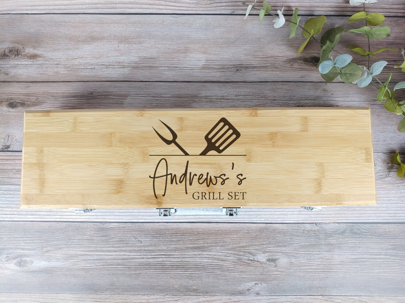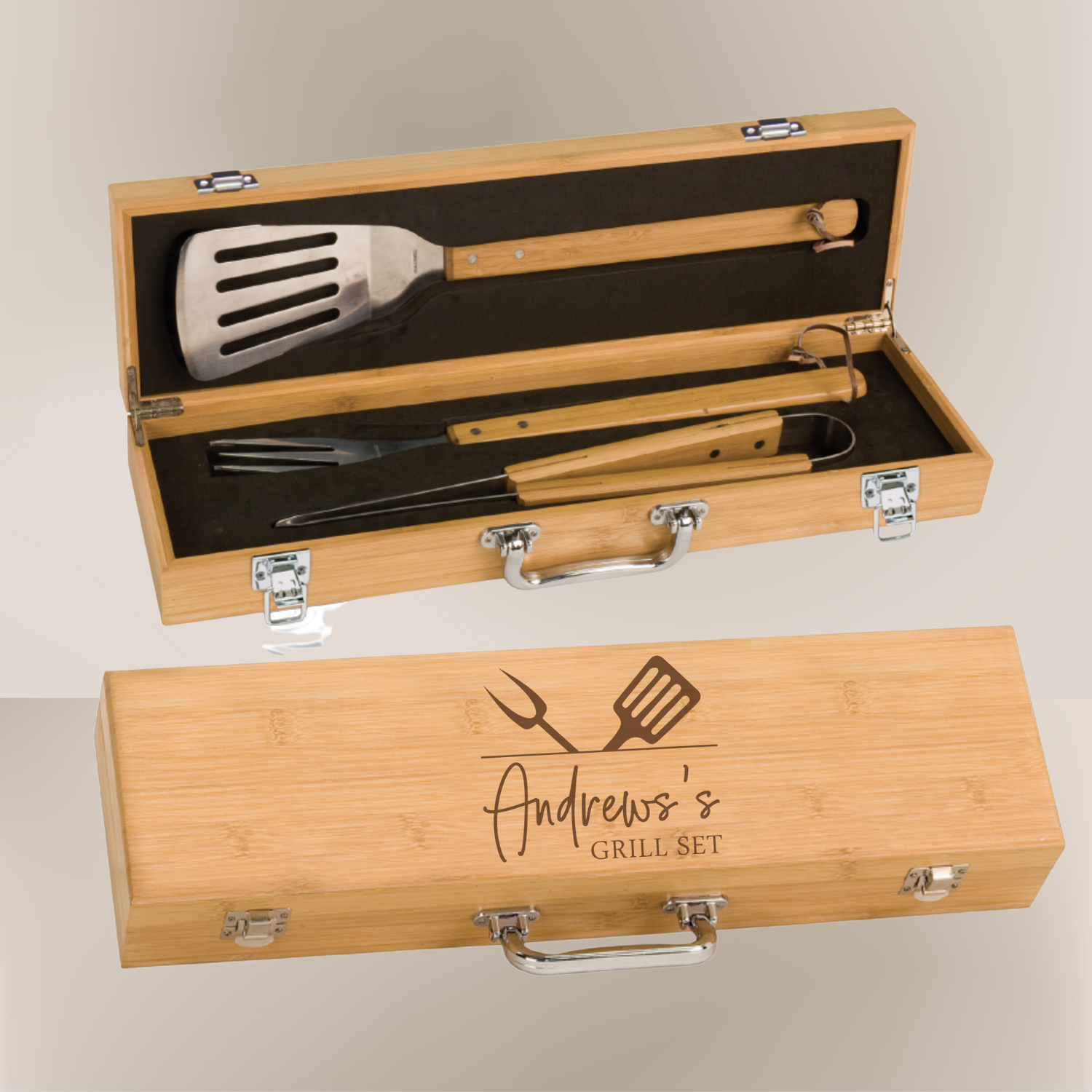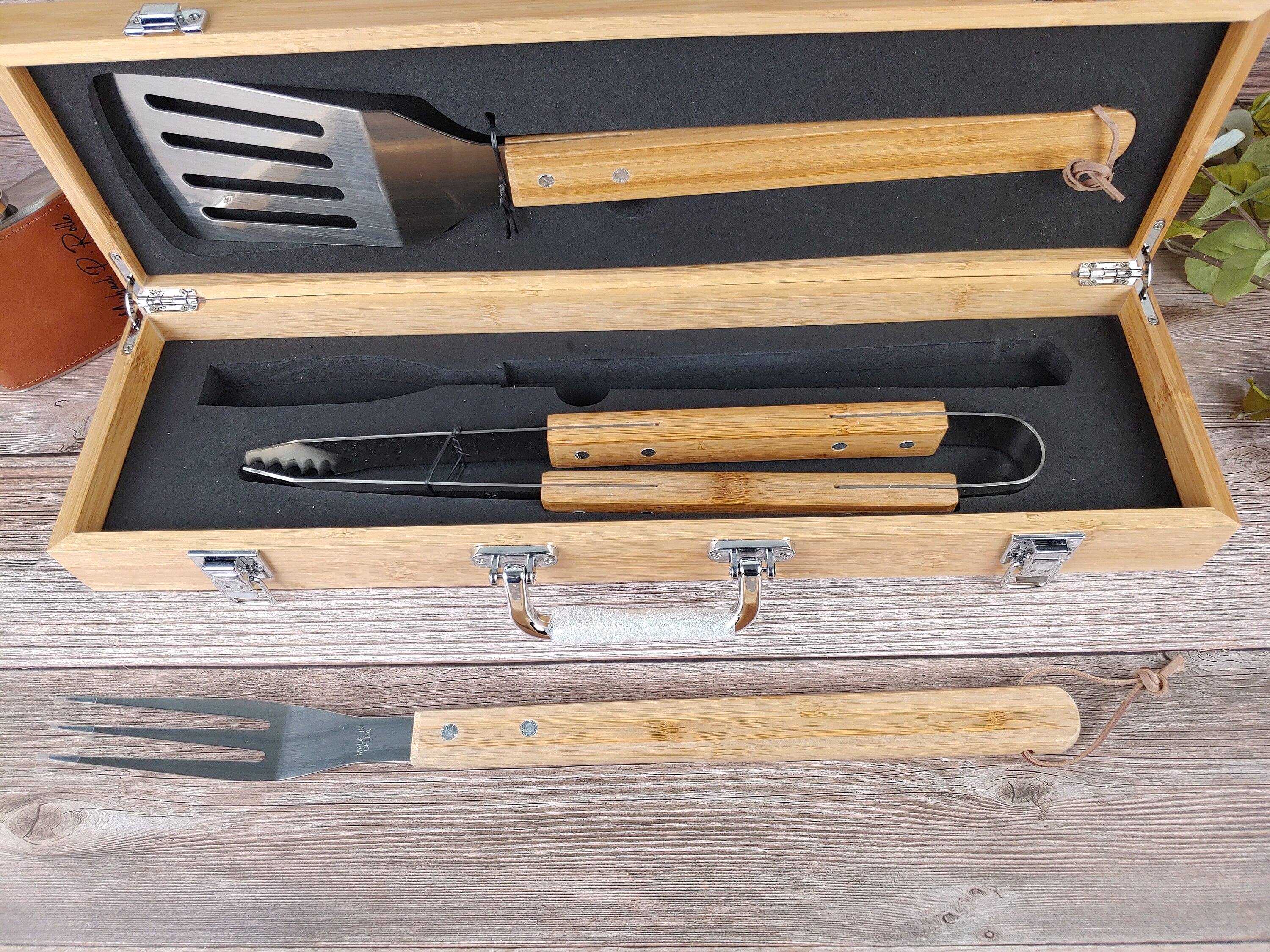 Turn up the heat with this Custom Engraved BBQ Set, the perfect gift for grill masters, backyard chefs, and BBQ lovers! This bamboo barbeque tool set includes three must-have grilling tools β a sturdy spatula, tongs, and fork β all neatly packed in a sleek, personalized bamboo case. πͺ΅β¨