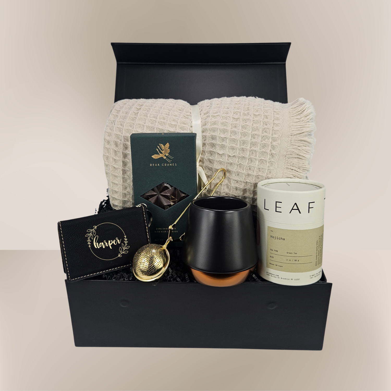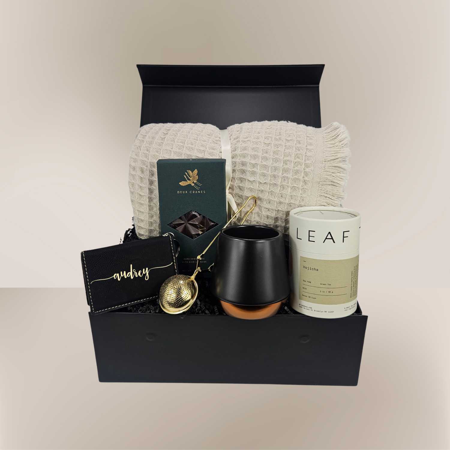 Give her comfort for the couch and polish for the purse. This curated set pairs slow-down staples—gourmet tea, a ceramic mug, a waffle-soft throw, and premium chocolate—with a personalized vegan-leather card wallet she’ll use every day. Thoughtful, practical, and beautifully giftable.